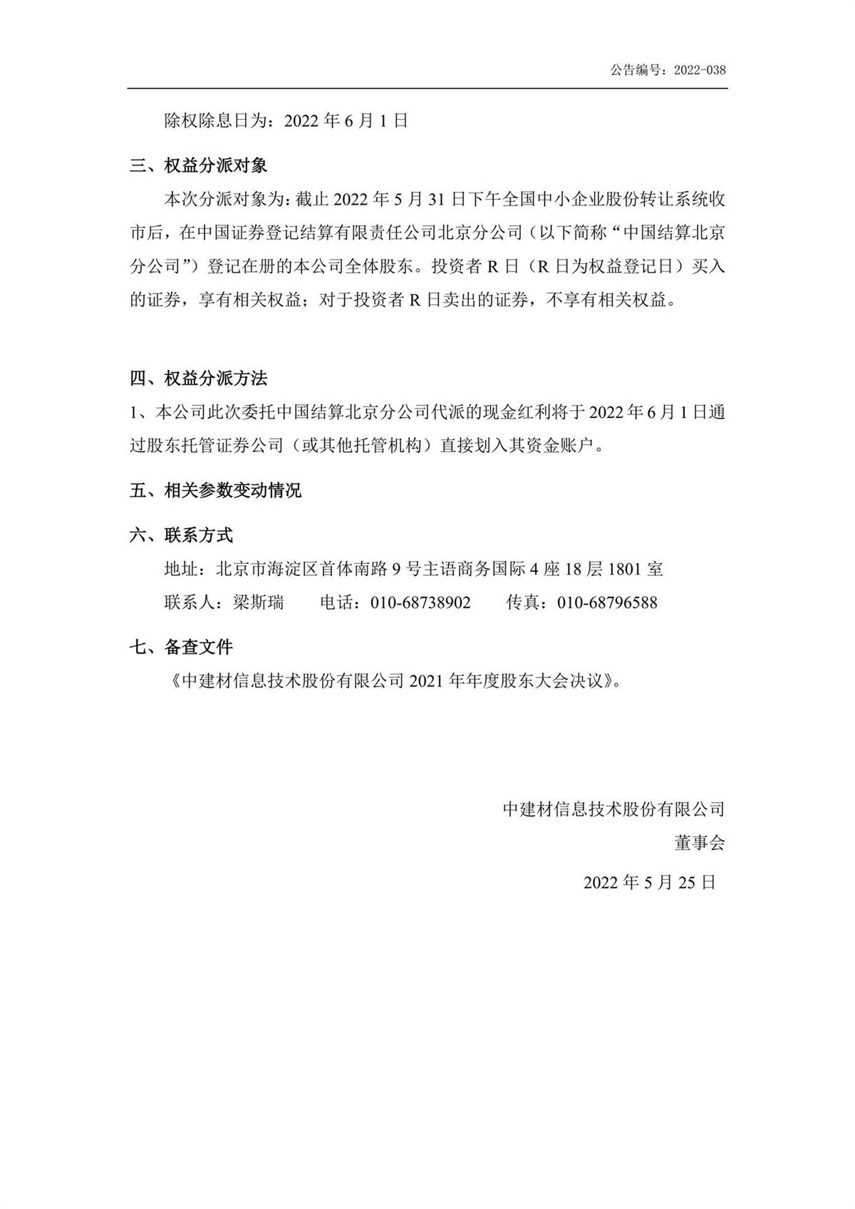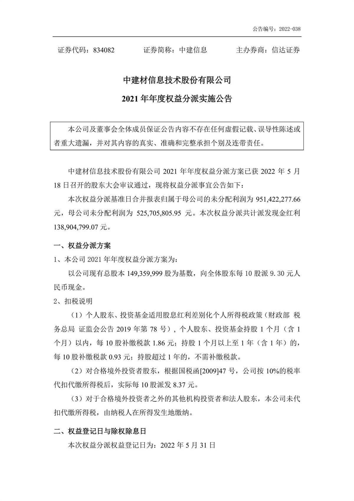 中建信息2021年年度權益分派實施公告